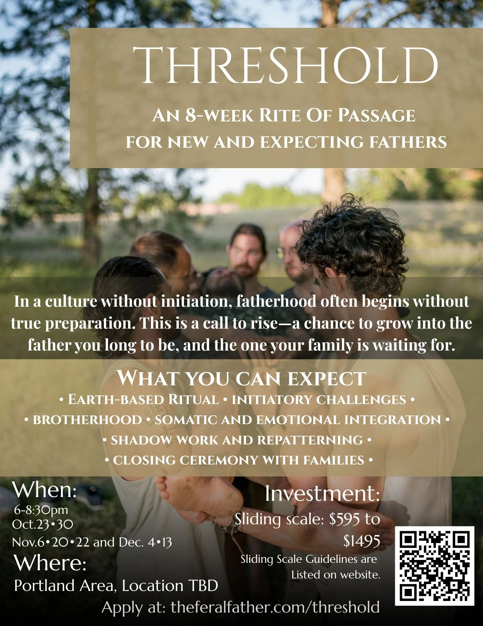 In a culture that leaves men uninitiated and often unprepared for the realities of fatherhood, Threshold offers a container of brotherhood, ritual, and embodied practice to help men step more fully into their role. This is a space to reconnect with yourself, with other fathers walking the same path, and with the deeper source that holds us all—so you can meet fatherhood with presence, courage, and love.